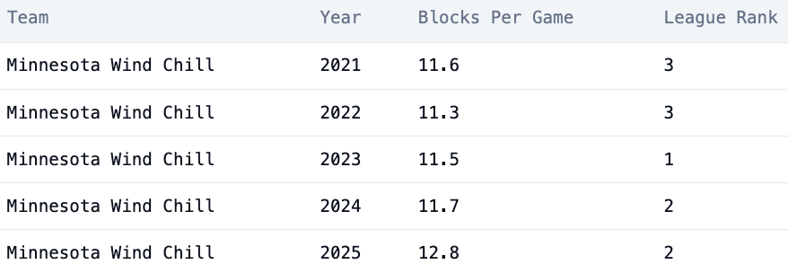 The Wind Chill dominated the block category last year, and that likely won't change in 2026. Seven players had at least 10 blocks in 2025, a number that could rise to nine this season as Noah Coolman and Lukas Ambrose may join the group. Another potential member of that group is going to be Brandon Matis, who earned All-Defense in honors in 2024 after leading the team in blocks, returning from being injured all of 2025.