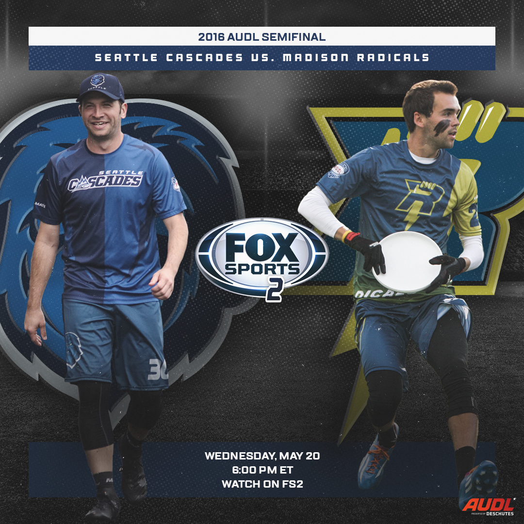 The 2016 Seattle-Madison Semifinal premieres on FS2 today (on Wednesday, May 20) at 6:00 PM/ET. In addition, prior to that Cascades-Radicals classic, fans can watch an encore performance of the 2017 AUDL Semifinal game between the Toronto Rush and the Dallas Roughnecks starting at 3:30 PM ET. Also, Matt Rehder, a key member of the Cascades in 2016, will be LIVE with Lep! on the AUDL’s Instagram at 8:00 PM/ET this evening, reminiscing about the comeback among other memories from his unique ultimate career.