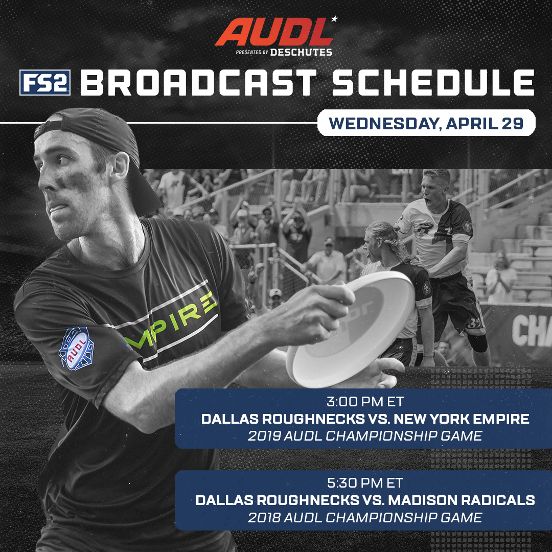 The Radicals-Roughnecks Championship Game premieres on FS2 today (on Wednesday, April 29) at 5:30 PM/ET. In addition, starting at 3:00 PM/ET this afternoon, fans can watch an encore performance of the 2019 AUDL Championship game between the New York Empire and the Dallas Roughnecks. If your DVR malfunctions, an encore showing of the ’18 title game will re-air this Saturday, May 2, at 12;00 PM/ET on FS2.