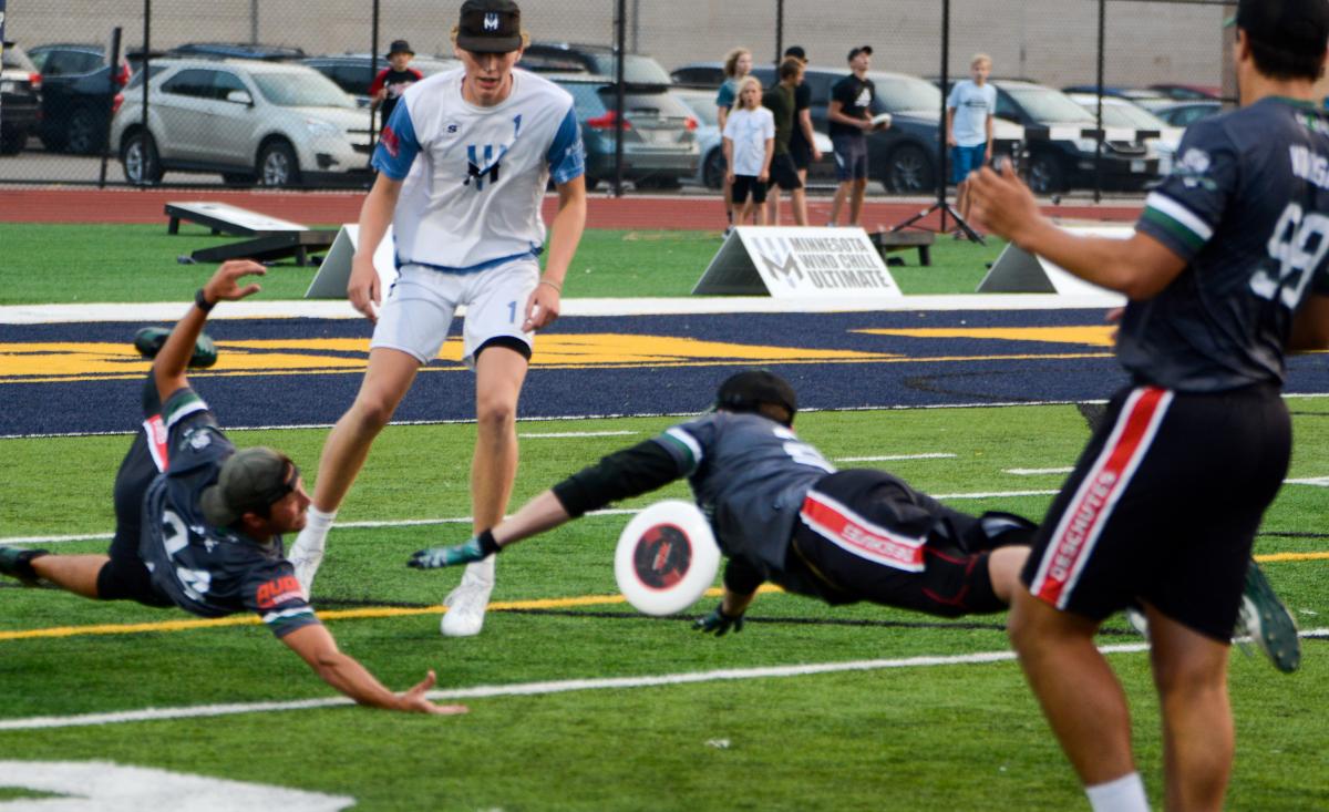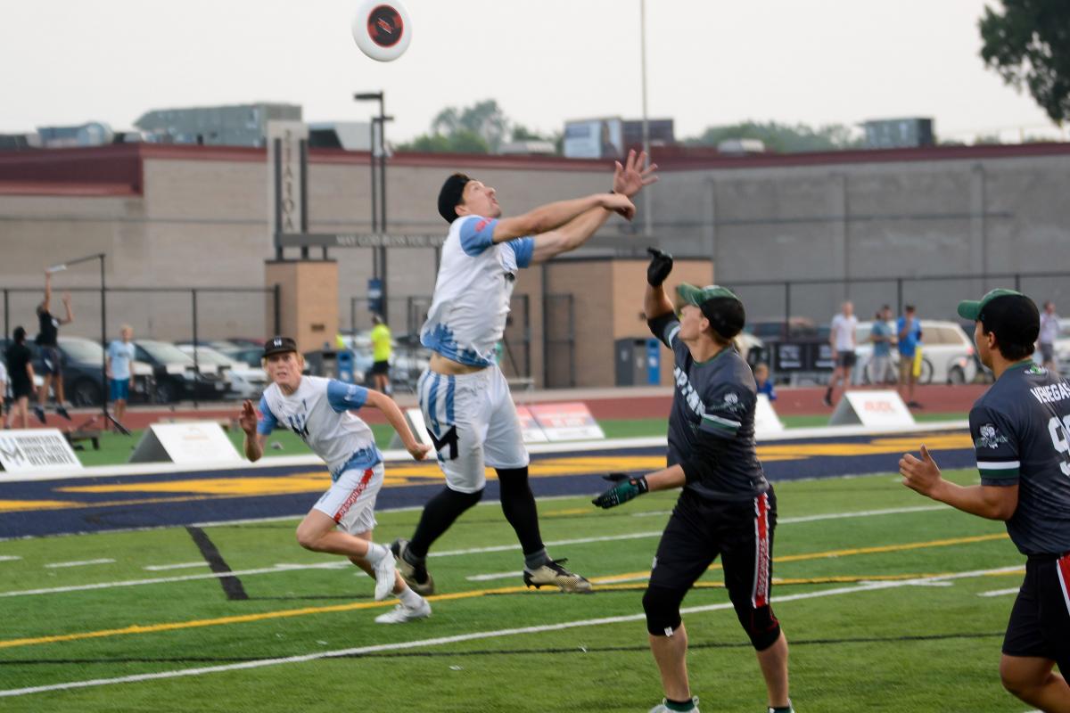 “My initial thought was to drop it into Carter’s hands since I knew we had little time left and he was a so close to me—I literally tapped him on the head with the disc so he would turn around,” said Hutton. “The Minnesota defenders were able to close really quickly, and I was essentially left with no time to stand up and a double team closing in on me. I never got a look at the clock because it was on the opposite side of the field. I saw Mason Zetsch in the back of the end zone and put the disc up in the air without really knowing which way he was cutting. I thought I gave it enough air for there to be a chance, but the wind got under it and took it a little further than I anticipated.”