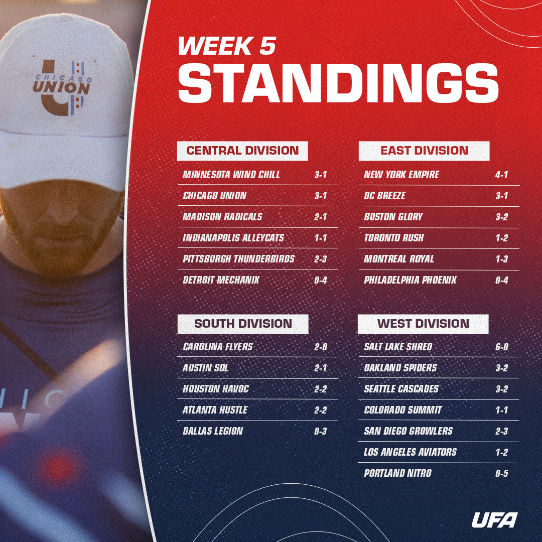 Meanwhile, Minnesota remains the favorite in the Central, responding to their Week 4 blip with a strong final three quarters against the Radicals this past Friday. Matt Rehder may not be the most consistent playmaker, but he gives the Wind Chill offense an explosive and slightly more versatile hybrid alongside Quinn Snider to make things happen downfield. And Bryan Vohnoutka, even in his mid-30s, remains one of the most underrated two-way performers in the entire league. With road wins over Chicago and Madison, the Wind Chill’s status atop their division is clear, though that certainly does not mean Minnesota will finish atop the quadrant with interdivisional battles against Colorado and New York still looming on the schedule.