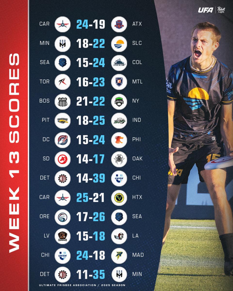 Chicago (12-0), Salt Lake (11-1), Atlanta (9-3), and Boston (9-3) are ready to host division title games in a couple weeks, while the other eight playoff teams are gearing up for elimination ultimate this Saturday.