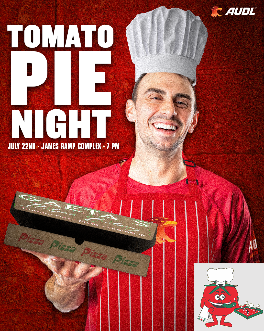 Instead of the somewhat cliche “Dollar Dog Night”, it will be “Dollar Tomato Pie Night”, with slices of Gaeta’s famous pies for just a buck. Adding to the festivities is a tomato pie eating contest at halftime, and Gaeta’s giveaways all night long. “We’re a Philly team, with a roster of mostly Philly guys,” says Goodtimes, “So we’re thrilled to be collaborating with a local brand as iconic as Gaeta’s. We’re going to have a lot of fun, while also celebrating one of the many culinary treats that make Philly so unique.”