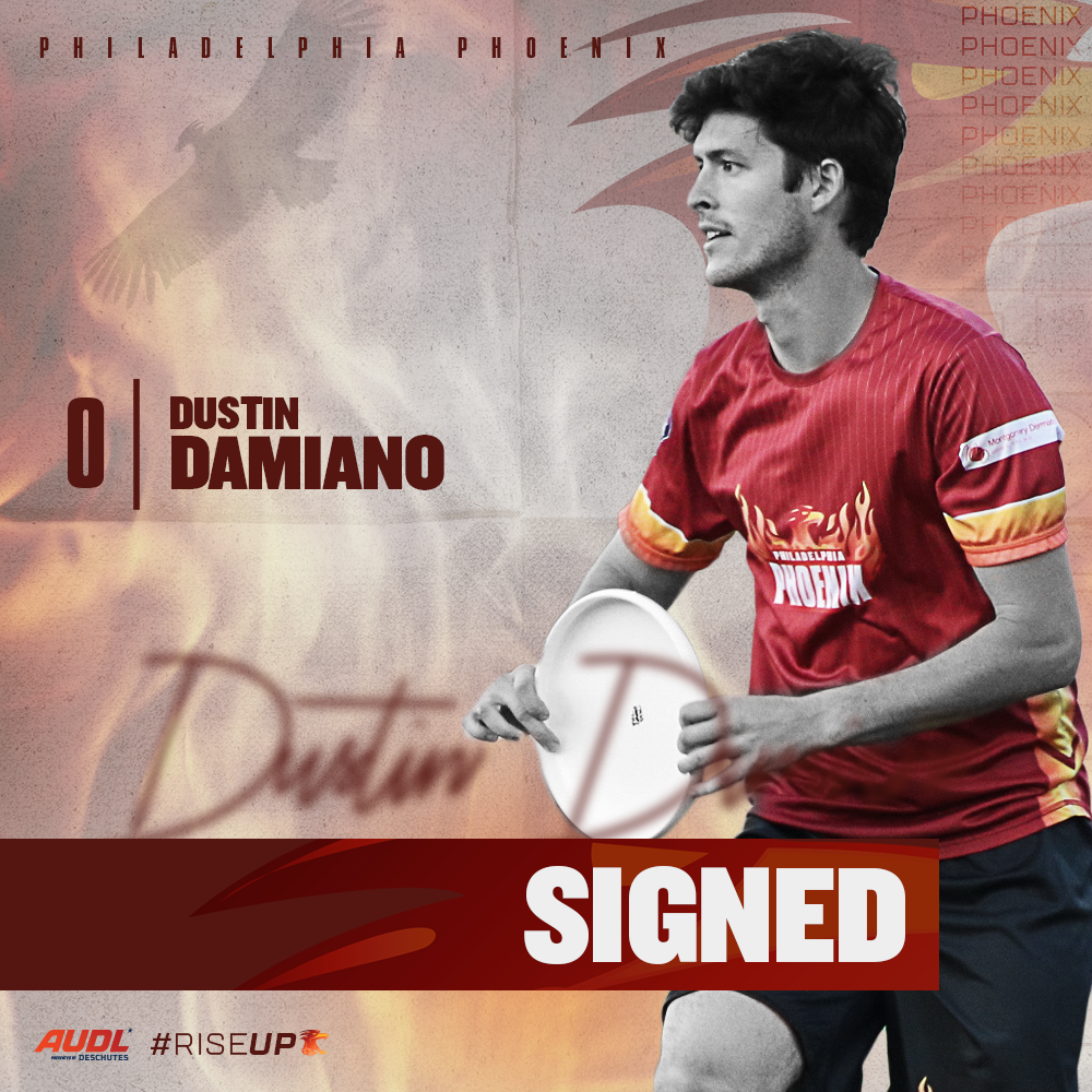 PHILADELPHIA —Dustin Damiano has signed to the Phoenix, making 2020 his fourth AUDL season. The first handler to sign with the Phoenix, Damiano has been a critical piece of the team’s offense since he rejoined the franchise in 2018. Standing at 5-foot-11, Damiano combines quickness and agility with steady disc skills, offering versatility favored by Phoenix coaches. General Manager, Jeff George said, “Damiano sets himself apart from other handlers in the league with his quick feet and with his ability and desire to cut deep. Opposing defenders have their hands full by needing to keep an eye on him at all times or he’s gone — not many can do it.”