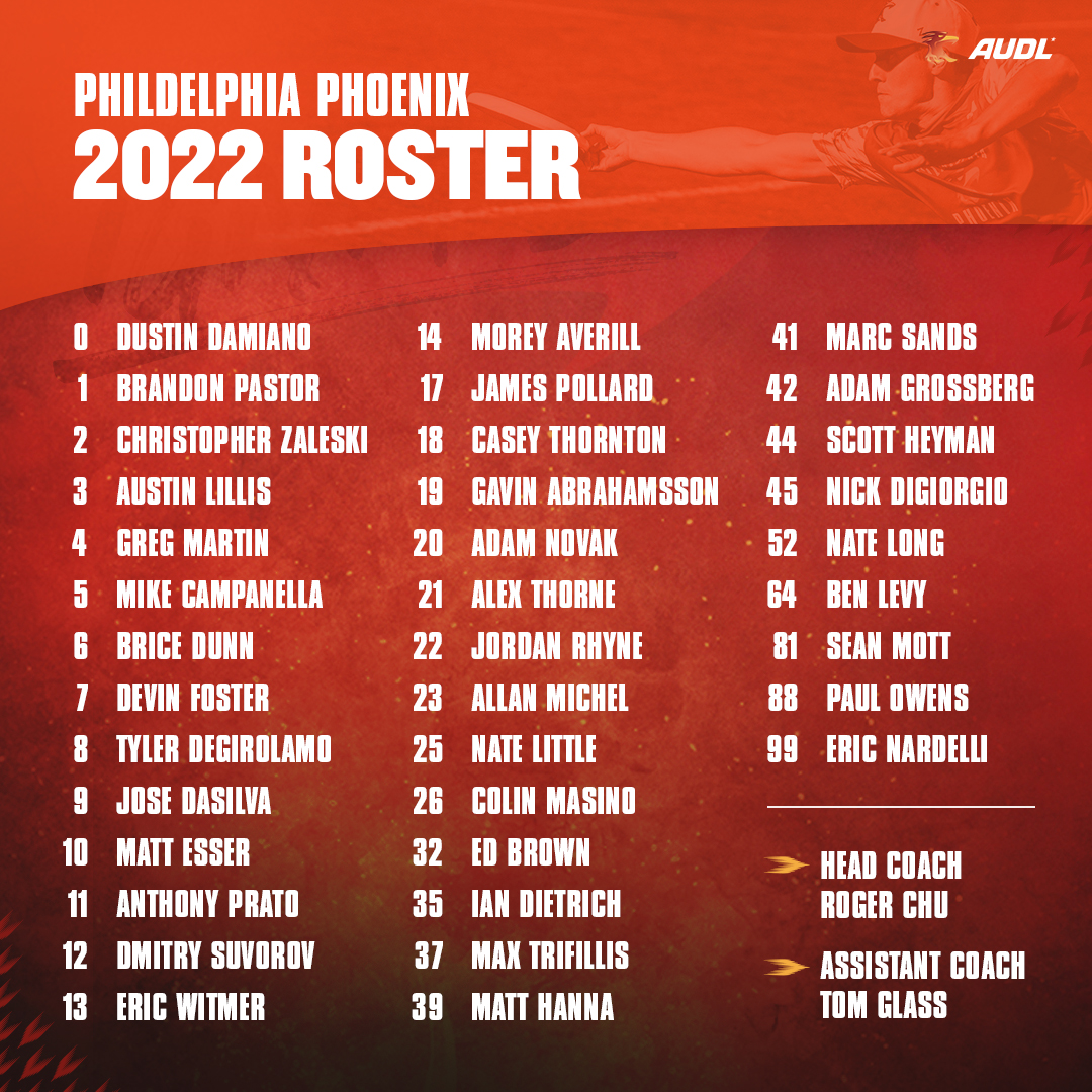 PHILADELPHIA, PA  - The Philadelphia Phoenix announced today their full roster for the 2022 season. Almost all of last year’s stars return, including the AUDL’s 4th leading goal scorer in 2021, Greg Martin, and the team’s all-time assist leader, Sean Mott.