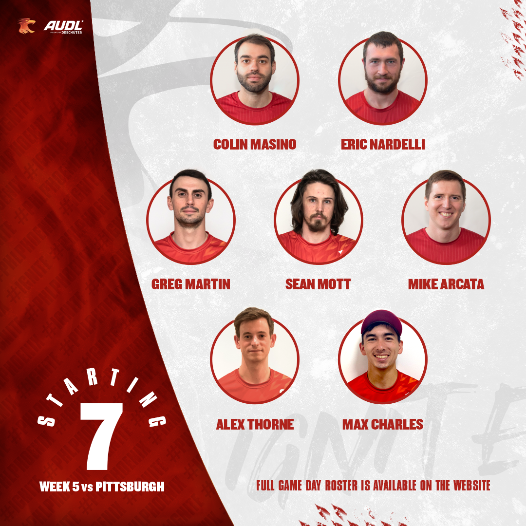 This is our full roster for our July 3rd matchup at the Pittsburgh Thunderbirds: Alex Thorne Allan Michel Brandon Pastor Colin Masino Dustin Damiano Eric Nardelli Eric Witmer Greg Martin Ian Dietrich Matt Ballman Matt Ellis Matt Esser Matt Hanna Max Charles Mike Arcata Nate Little Nick Digiorgio Paul Owens Scott Heyman Sean Mott Catch all the action only on AUDL.tv!