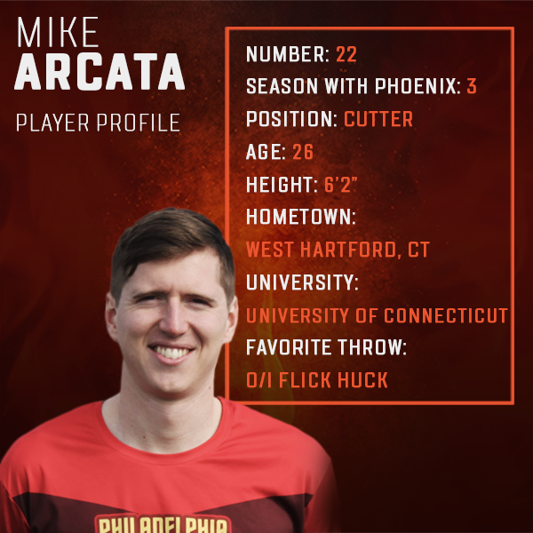Arcata began playing ultimate in pick-up games with friends at Hall High in West Hartford, CT. He went on to lead his college team, UConn Grind, to the cusp of college nationals in 2013. After moving to Philadelphia in 2015 he joined in professional level play, uniquely going directly from college to professional play. He made his way to the Phoenix roster in 2017. Arcata is one of the main cutters on the Phoenix offense and has the ability to sky even the most proficient players in the air, making him an integral player on the field. He finished last season as one of Philadelphia’s top performers; coming in second on the team in goals (32) and blocks (12) while dishing out 37 assists, ranking third on the team.