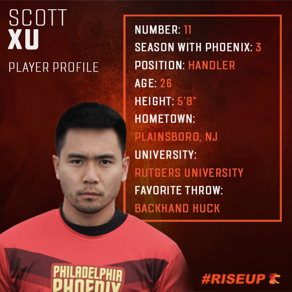 Phoenix veteran Scott Xu hails from Plainsboro, NJ, where he first played ultimate in 2006 as a freshman in high school. Xu went on to play at Rutgers University where he helped grow the ultimate program as a captain and starter. His collegiate career culminated in an appearance at the 2014 College National Tournament during his senior year. Helping to grow the ultimate program at Rutgers into a top performing team is one of his proudest accomplishments. Xu has continued to play for various club teams as a starter and captain. He has found ultimate to be an outlet allowing him to express individuality and passion. Xu is returning for his third season with the Phoenix. He is an excellent handler with a powerful throwing arsenal; this, combined with his quick speed, makes him difficult for opponents to guard. He easily switches between offense and defense, making him an effective player with the disc in his hands. Xu is a first-generation Chinese-American and works as a consultant in pharmaceutical sales and marketing.