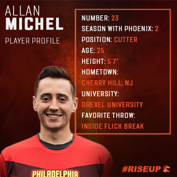 Allan Michel hails from nearby Cherry Hill, NJ. He first heard about ultimate while attending Drexel University, and learned of their school team. He went on to play for Drexel and serve as a captain in his fifth year. Michel is returning for his second season with the Phoenix. His strength and physicality define his playing style, challenging the notion of a traditional ultimate player and forcing opponents to adapt quickly to his staunch defensive presence. As a defensive cutter, Michel is most looking forward to battling the DC Breeze and reigning AUDL MVP, Rowan McDonnell. When he’s not on the field, Michel enjoys playing in the chamber orchestra at his parish along with his father and brother. Michel currently works in electrical engineering.