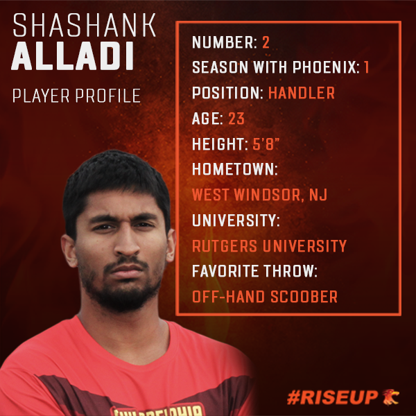 West Windsor, NJ native Shashank Alladi was introduced to ultimate while he was looking for a new sport to try his senior year of high school. Friends invited him to practice with his high school’s team, and after just a few sessions he was hooked. When Alladi later attended Rutgers University, he joined their ultimate program and became a captain. A pivotal moment of his ultimate career was helping take Rutgers to the 2014 College National Championship tournament in his freshman year. He says the season lit a passion within to become a top ultimate player in the country. The 2019 season will be Alladi’s first with the Phoenix, though not his first in the AUDL as he previously played for New York Empire. A quick and creative thrower with the ability to generate power on deep throws, Alladi has now assumed the role of handler on the Phoenix defense. He says he’s ready to match up against his former teammates because, “in order to be the best you have to beat the best”, referring to the Empire's 2018 East Division championship. Alladi works in the field of biomedical engineering.