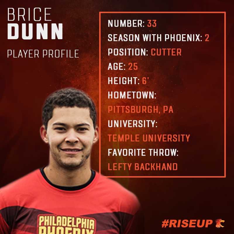 Growing up outside of Pittsburgh, Brice Dunn played baseball his whole childhood. He found ultimate when his college roommate freshman year took him to a Temple University team practice. He continued to play for Temple throughout his tenure, becoming a captain in his senior year. While still in college Dunn entered club play, and played with Philadelphia Patrol at the 2016 National Championship Tournament. One of his proudest moments in ultimate has been watching the growth of the Temple University ultimate program. The 2019 season will be Dunn’s second with the Phoenix and he has already made a name for himself as a shut down defender, even against star players on opposing teams. He is one of the Phoenix’s strongest and most explosive players, creating impressive and highlight-worthy plays on both offense and defense. Dunn says he’s ready to take on New York Empire and match up against their talented roster. As a person of African-American and Caucasian descent, Dunn enjoys the inclusivity found in the ultimate community and hopes more African-American youth will find the sport of ultimate. Dunn works in Digital Advertising.