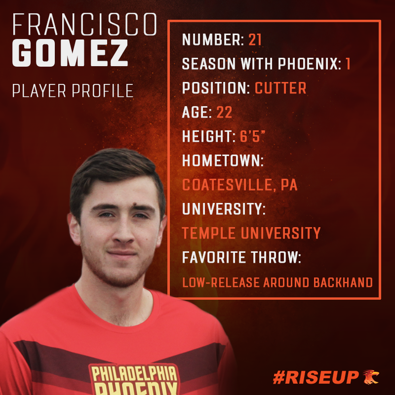 Growing up in Coatesville, PA, Francisco Gomez played ultimate weekly with friends. He grew even more passionate about the sport while playing for Temple University, where he majored in film studies. He knew he was hooked on ultimate after playing in his first tournament with Temple. Despite his love of being on the field, he counts coaching False Alarm, Temple’s B team, as one of his proudest moments and the highlight of his ultimate career thus far. Gomez is joining the Phoenix roster for his rookie season. He is a strong physical player who will challenge any opponent in deep space. Gomez can use his height, as one of the tallest players on the team, to create space and dominate as a receiver. He is excited to match up against the New York Empire this season. Gomez is a second-generation American with Mexican and Irish roots.
