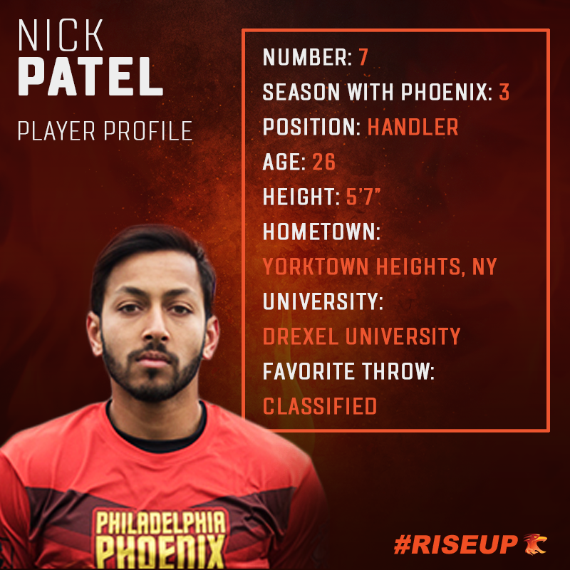 New York state native Nick Patel transitioned from running track and cross-country in high school to ultimate his freshman year at Drexel University. He is no stranger to success in ultimate, his accomplishments including a trip to the club National Championship Tournament and winning a pro-league championship in 2016. Patel is returning to the Phoenix for his third season and is known as an explosive and smart defender who can challenge opponent’s top handlers. His speed makes him a consistent threat on the Phoenix defense. He always enjoys matching up against former coach, Darryl Stanley, and his friends on the DC Breeze. Patel’s parents immigrated to the US from Gujarat, India, making him a first-generation American. As a young child he lived for some time with family in India before returning to Yorktown Heights, NY where he was raised. Patel is currently pursuing his Doctorate of Dental Medicine at Temple University Kornberg School of Dentistry.