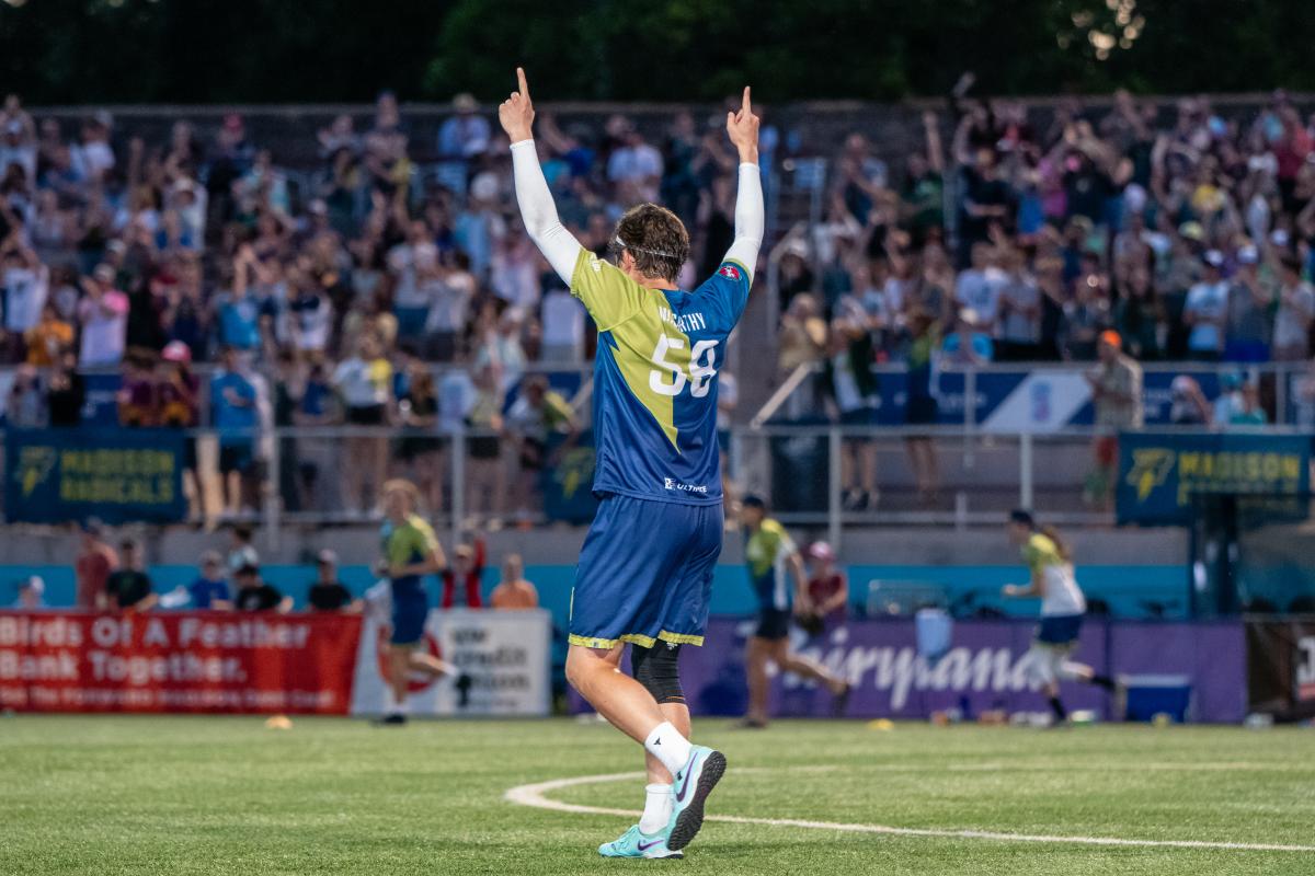 Colorado’s Alex Atkins had the disc in the red zone with time winding down when he put up a flick that floated a bit too much as it traveled into the front corner of the endzone. The float was all Carrico needed as he rose up and slapped it away, effectively icing the game and keeping the lead at one. The third of Carrico’s blocks led to a Radicals score, going up two with just under a minute to play.