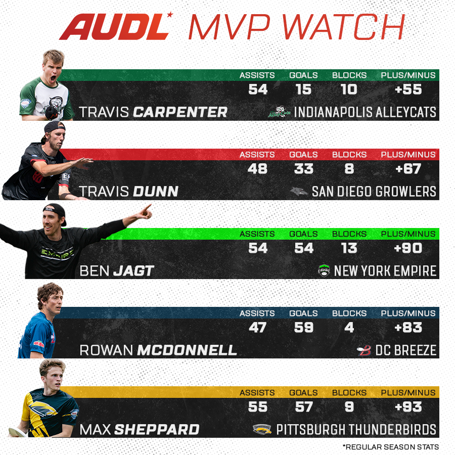 The 2019 AUDL season brought forth five MVP finalists, Indianapolis’ Travis Carpenter, San Diego’s Travis Dunn, Washington DC’s Rowan McDonnell, New York’s Ben Jagt, and Pittsburgh’s Max Sheppard. When comparing these All AUDL 1st Teamers, the easiest thing to compare is their regular season stats (this is a regular season award).