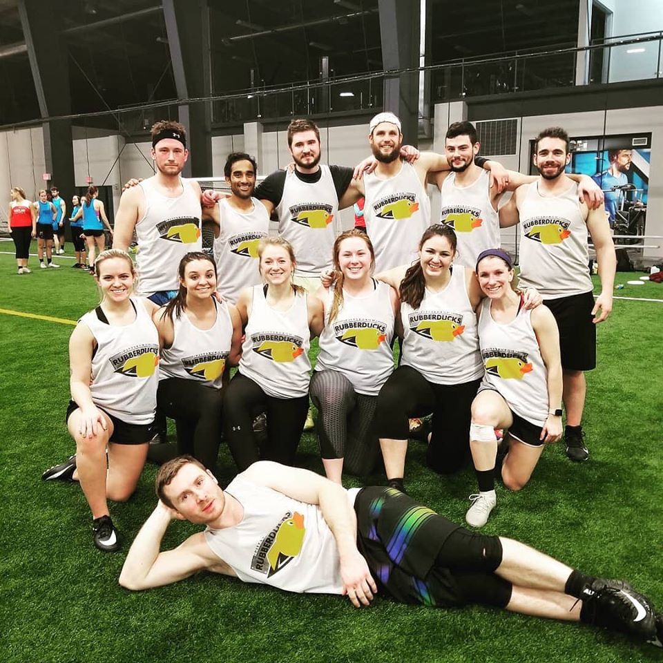 Kaitlyn Colbert (pitcured 2nd to the right in the front row) playing for the 'Rubberducks' at Community for Pittsburgh Ultimate's Winter League