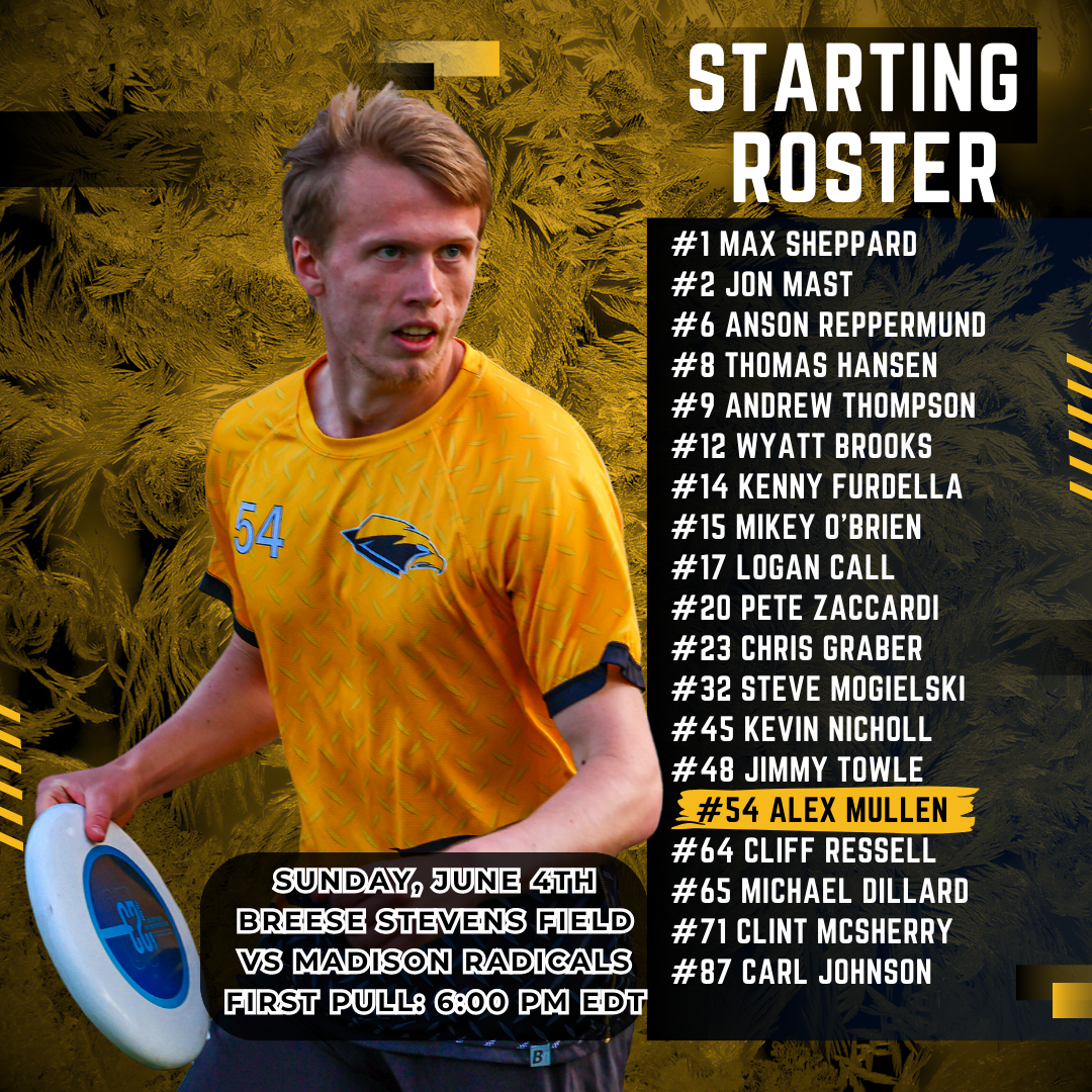 Returning to the AUDL roster report, Madison’s Brian Hart, Tom Annen, Jacob Wham, James Sykora, and Austin Johnson are out of the matchup. Not rostered to face the Black and Gold include David Nester, Ken Adams, Mac Weber, Jack Nelson, Max Sample, John Tan, Matt Grinde, Jake Rubin-Miller, Kevin Pettit-Scantling, and Kai Marcus.