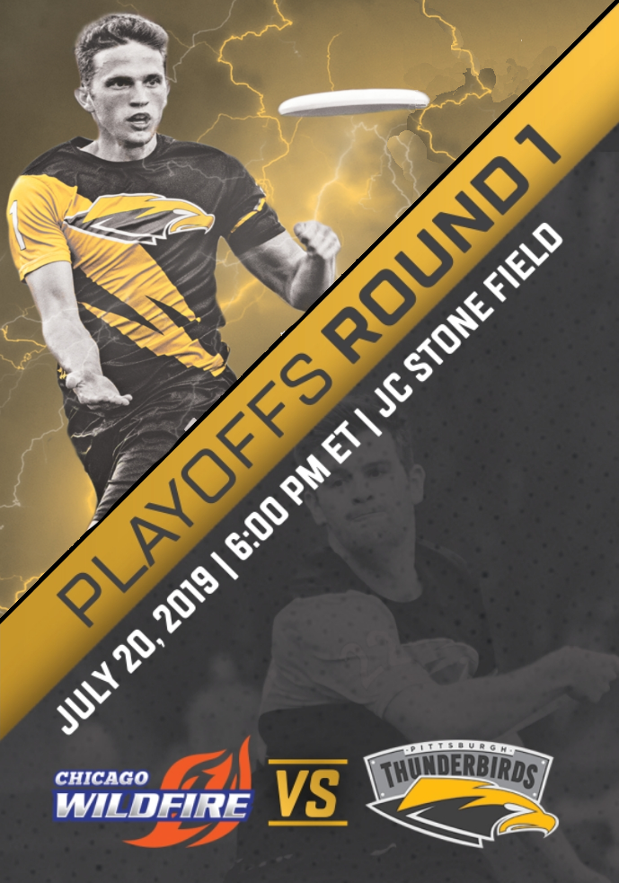 Allison Park, Pa. – The Pittsburgh Thunderbirds (8-4-0), who forged a record of 4-2 at JC Stone Field, welcome the Chicago Wildfire (7-5-0) Saturday, July 20, for the first round of the Midwest Division playoffs in the American Ultimate Disc League. Fans can catch the opening pull after the coin toss at 6:00 p.m.