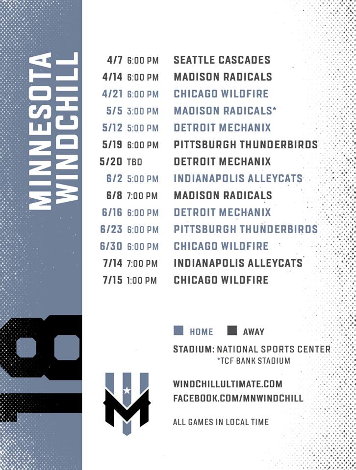 The 2018 Minnesota Wind Chill home schedule is set! The team will host their home games atthe National Sport Center Stadium in Blaine, newly renovated with state of the art turf just a few months ago. Our home opener is on April 28 against the Chicago Wildfire. Tickets are available now. All times listed are local.